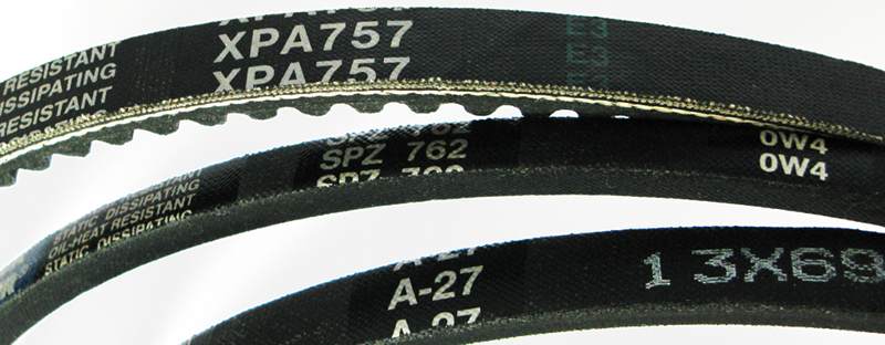 Oben: gezahnte Schmalkeilriemen. Mitte: nicht gezahnte Schmalkeilriemen. Unten: Klassische, breite Keilriemen.